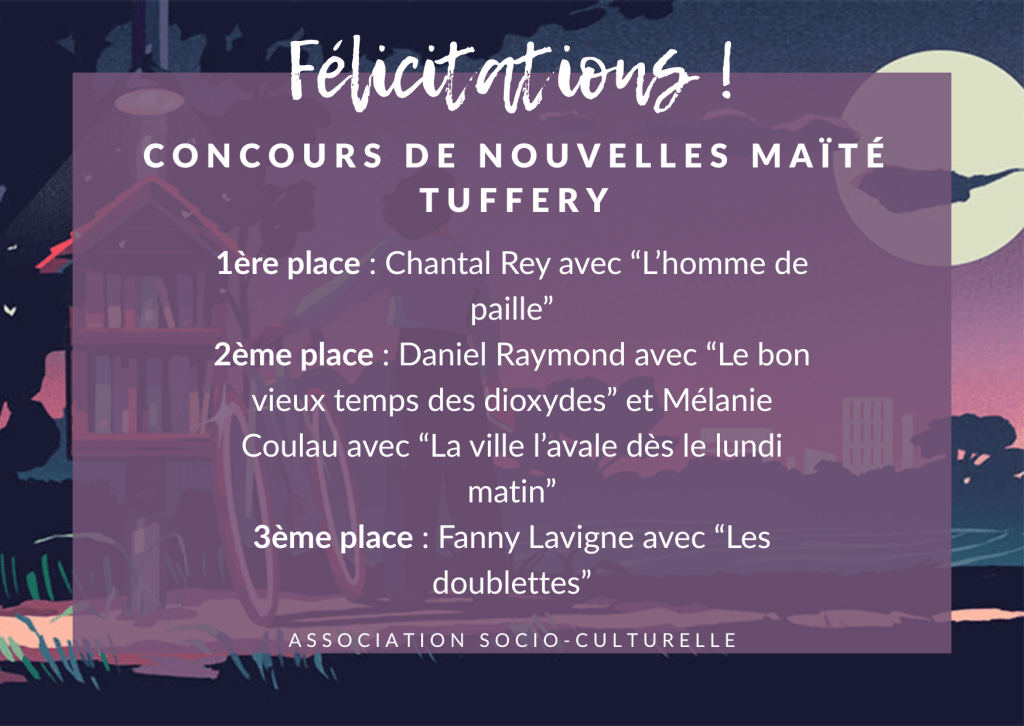 Enfin, à partir de 16 heures, la remise du prix Maïté Tufféry, décerné chaque année par l’ASC a offert au public l’occasion de découvrir quatre textes aussi différents que le premier prix : L’homme de paille, de Chantal Rey lu par Guy Pourtalier. Le deuxième prix récompensait Daniel Raymond pour Le bon temps des dioxydes. Le second prix ex aequo attribué à Mélanie Coulau, La ville l’avale dès le lundi matin ont été lus par Claire Adélaïde Montiel ainsi que le troisième prix attribué à Fanny Lavigne pour Les Doublettes.