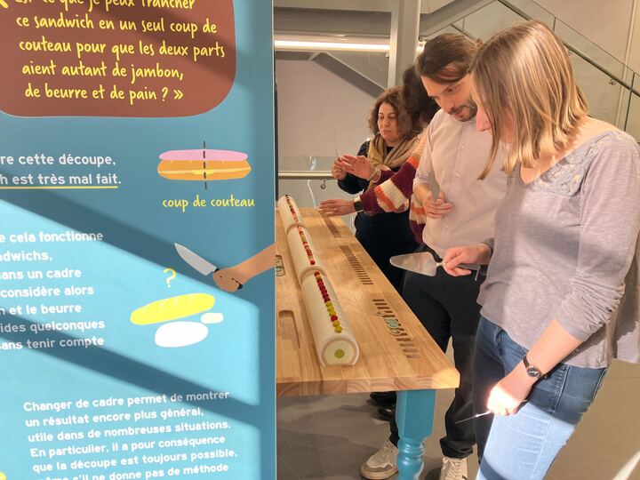 Après cette première étape, Olivier Druet , mathématicien directeur de recherche au CNRS et Nina Gasking responsable de la médiation, ont été chargés de la mise en forme de l’exposition. La scénographe Louise CUNA a mis en volume et en espace ; la graphiste Emma Lidbury s’est occupée du mobilier et les manipulations. D’autres corps de métier sont ensuite entrés dans la danse : développeur pour les jeux numériques, menuisier pour le mobilier…