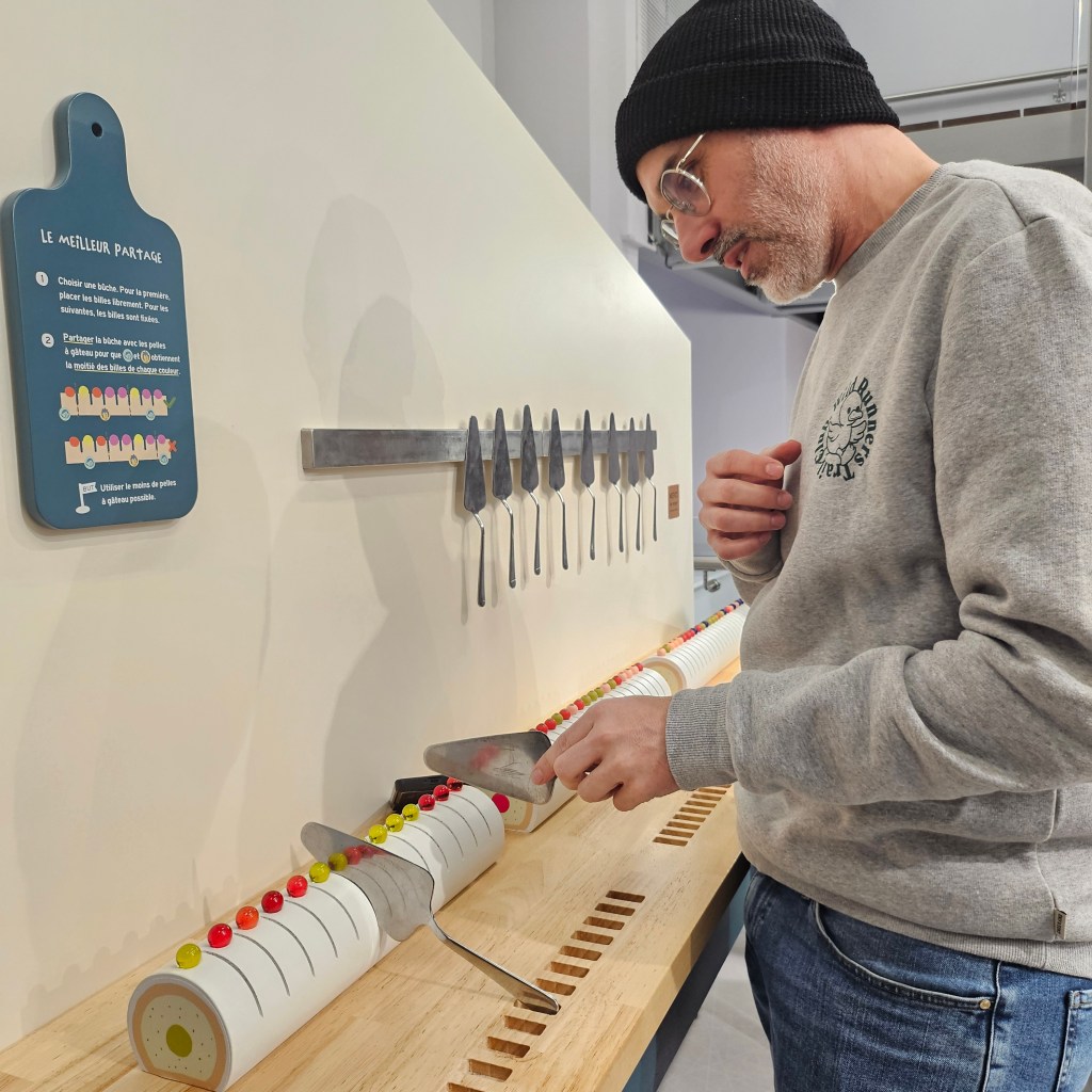 Dans la grande salle d’exposition du musée Fermat, le parcours comportant 4 espaces, 11 stands n’a rien d’impératif. Des questions sont posées, des manipulations sont proposées, des outils sont mis à disposition : listes, réglettes et autres. Au fil des stands on va découvrir, à travers des actions du quotidien et des objets aussi familiers qu’une boîte à gâteaux, des olives sur une pizza ou les fèves d’un gâteau des rois, les notions scientifiques qui se cachent sous les éléments de la vie de tous les jours.